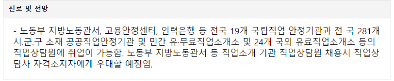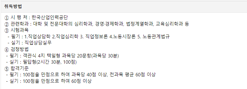 - 필기시험 과목: 직업상담학, 직업심리학, 직업정보론, 노동시장론, 노동관계법규