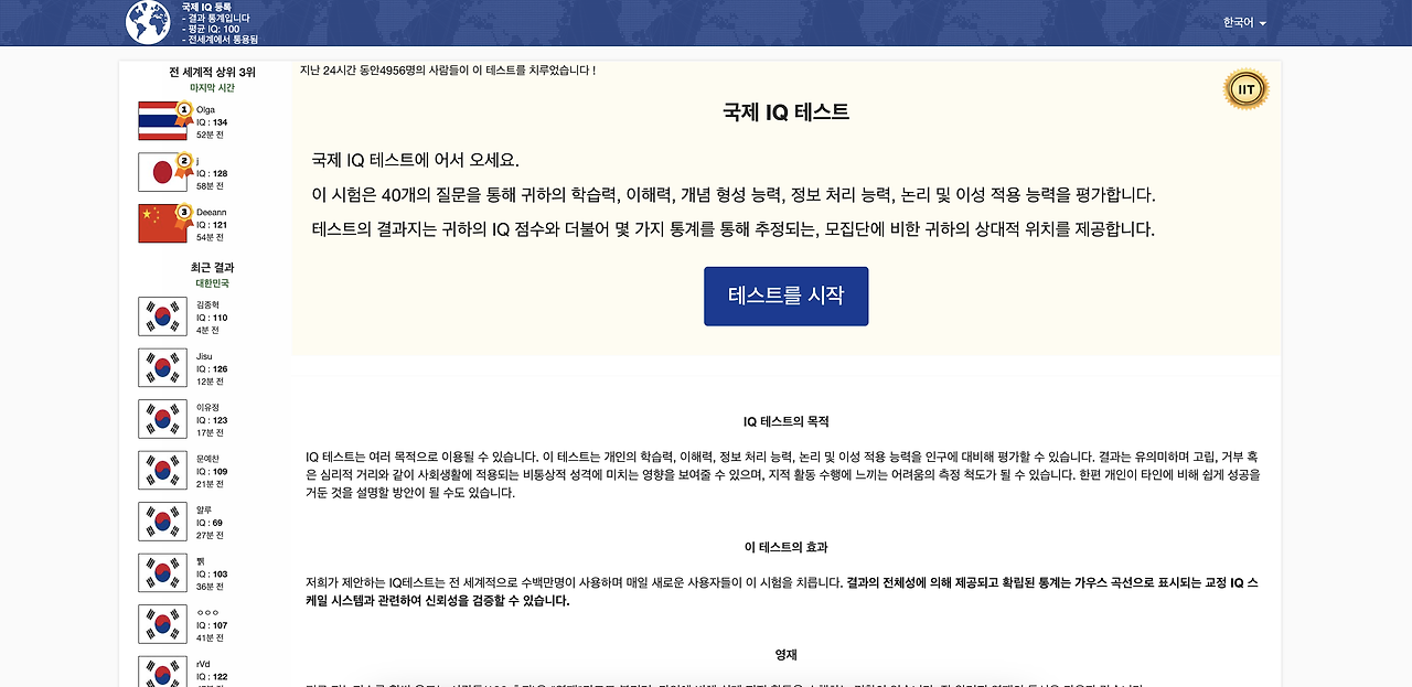 전 세계에서 인정되는 국제 아이큐 테스트를 무료로 해 볼 수 있는 곳을 소개해 드리니, 아이큐를 확인해 보시길 바랍니다!