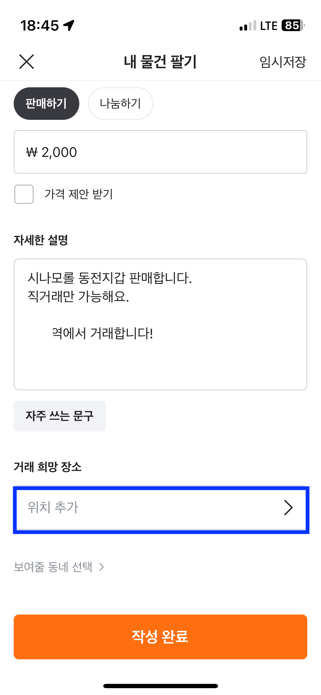 ✅ 설명을 다 쓰고, 아래로 쭉~ 내려 보면 거래 희망 장소를 쓸 수 있습니다.