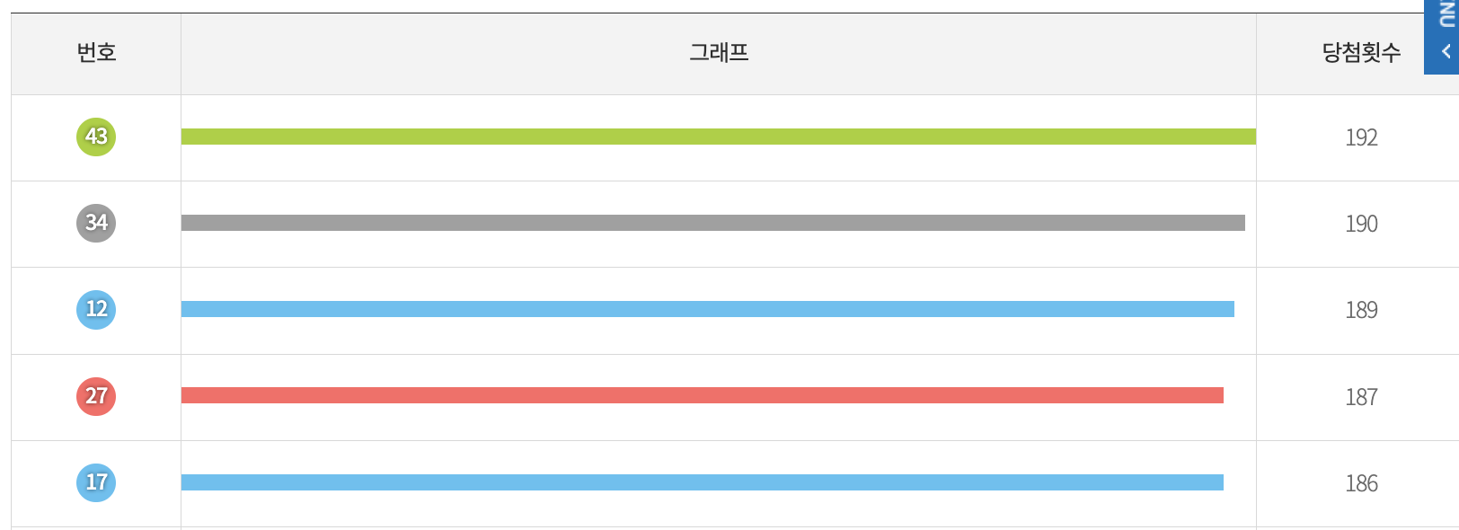 34, 12번또한 190회에 근접하기 때문에 43 / 34 / 12 번이 가장 많이 나온 숫자라고 할 수 있겠습니다.