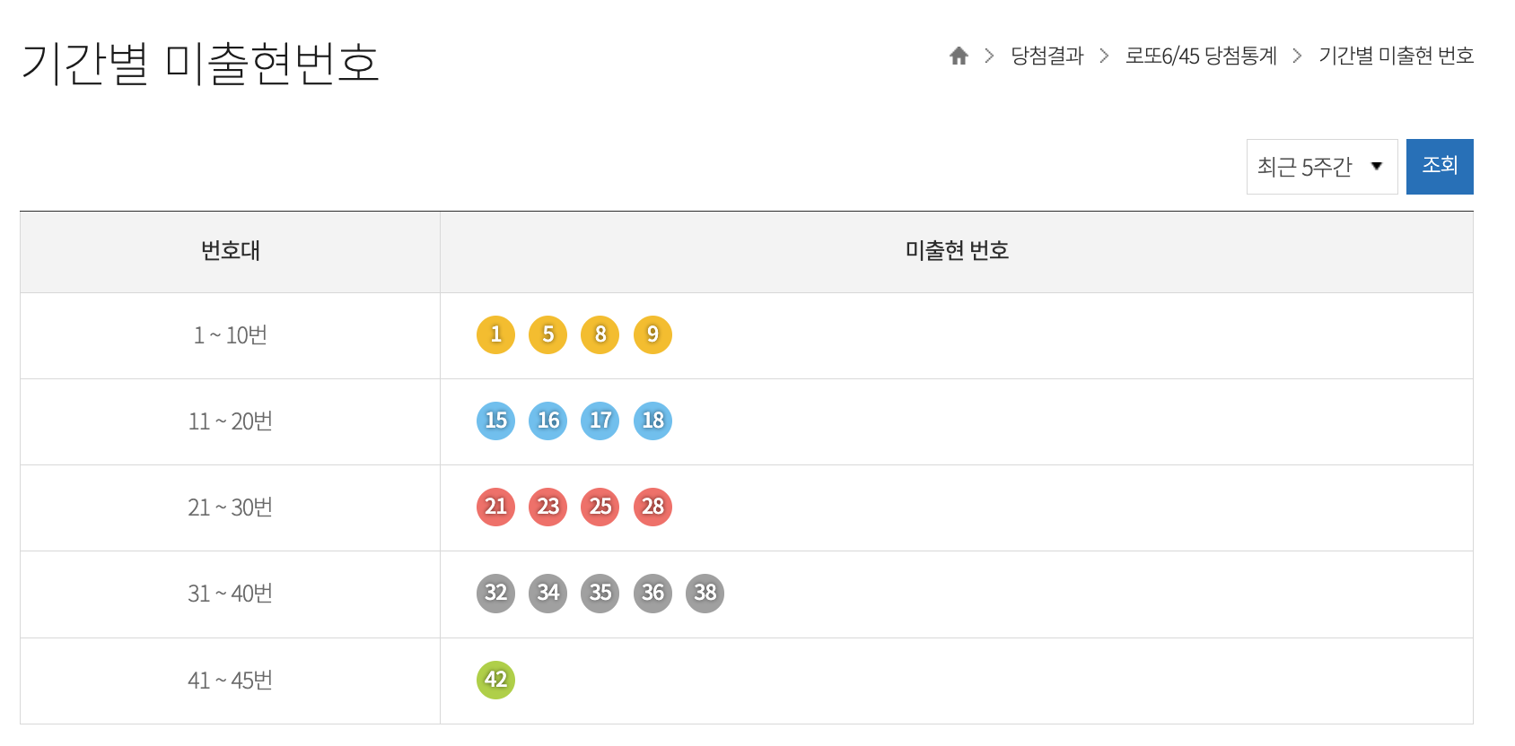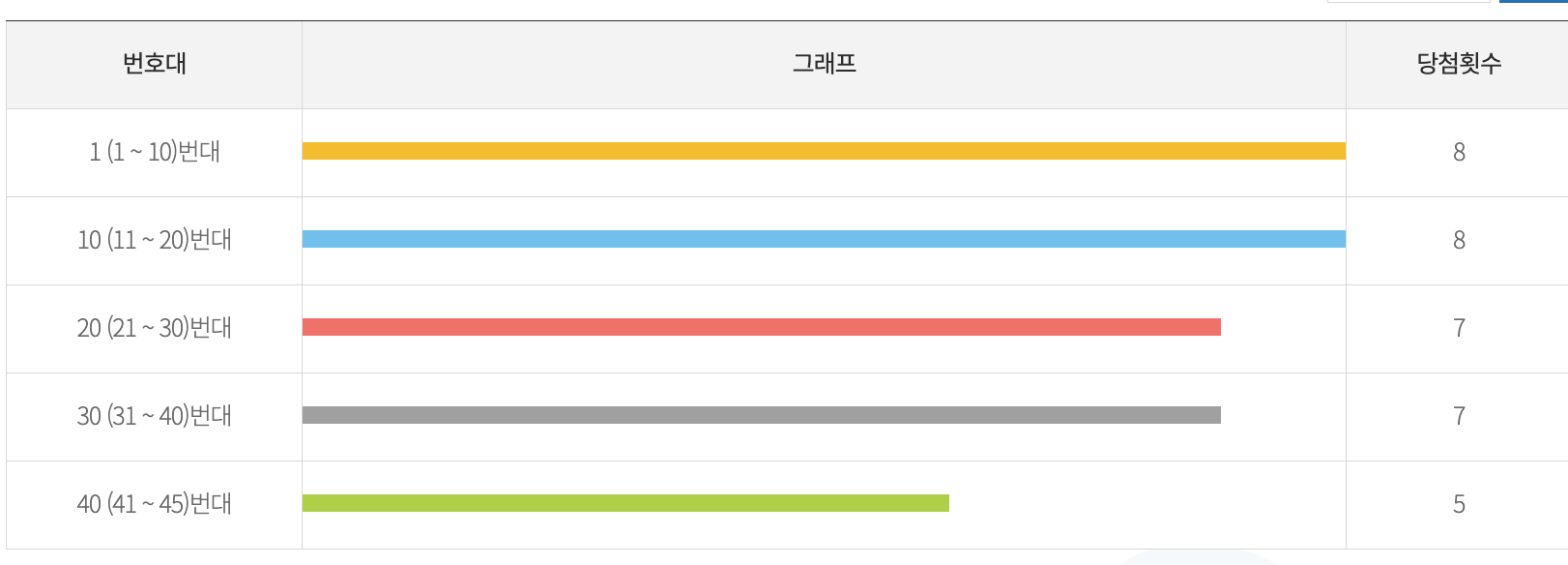 41번부터 45번까지의 숫자가 11.2%인 이유는, 초록색 번호가 총 5개이기 때문입니다. 만약 초록색 번호가 41번부터 50번까지였다면, 그 비율은 22.4%로 상위 3위에 해당하게 됩니다. 결국, 번호 분포는 균일하다고 볼 수 있습니다.
