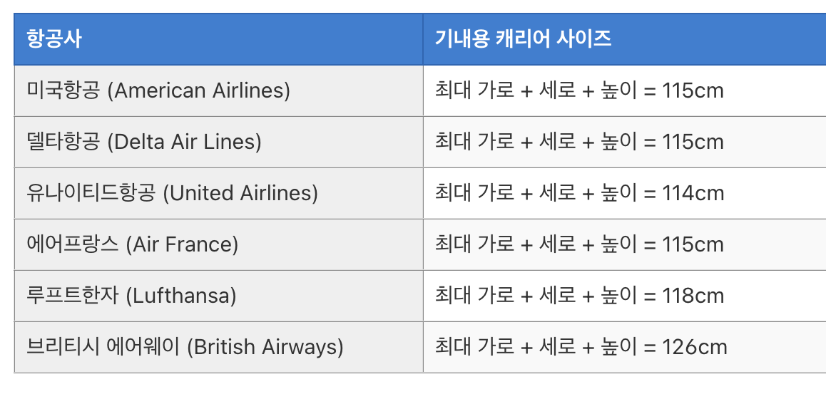 | 항공사 | 기내용 캐리어 사이즈 | 최대 무게 |