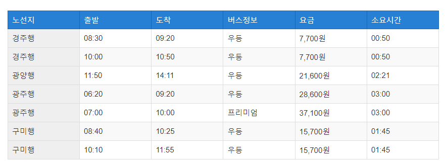| 목적지 | 우등 버스 요금 | 고속 버스 요금 | 소요 시간 |